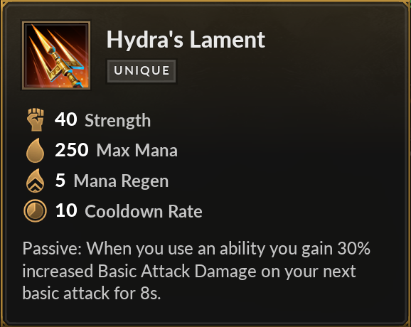 Hydra’s Lament is a key item multiply your basic attack damage after every ability.