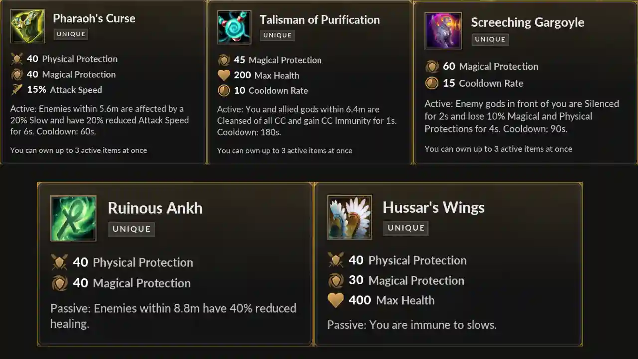 - Hussar’s Wings is a very expensive late-game option but provides excellent stats.