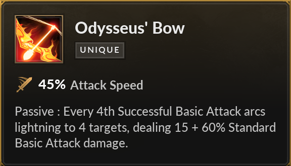 - If you’re snowballing and want more damage, pick Odysseus’s Bow, which enhances your on-hit effects.
