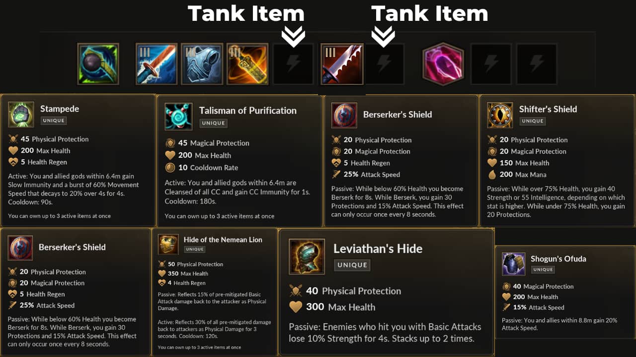 Hide of the Nemean Lion, or combined with Leviathan’s Hide, is excellent for killing physical damage carries while also tanking their shots with its reflect active.Screeching Gargoyle
