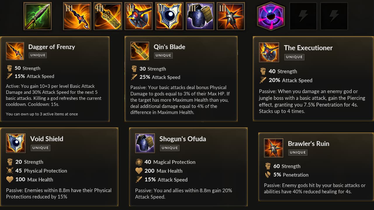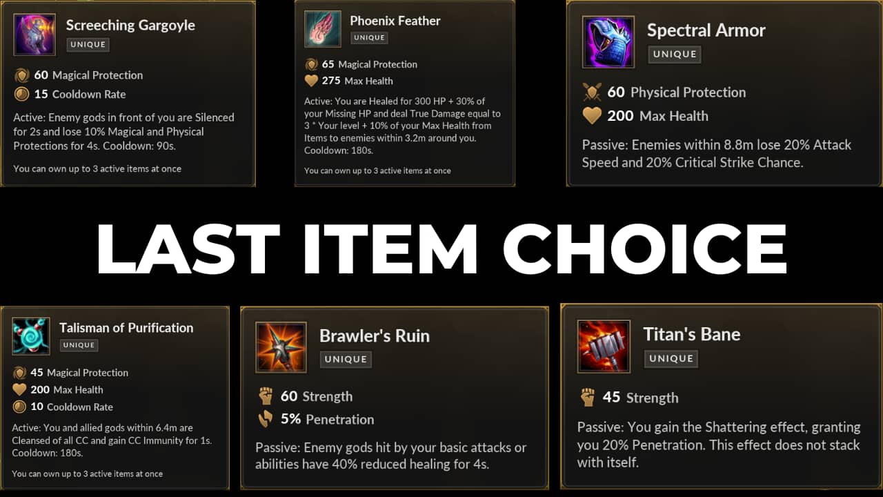 Starter Item for Conquest and Arena should be Bumba’s Golden Dagger for Jungle and Gilded Arrow for Arena